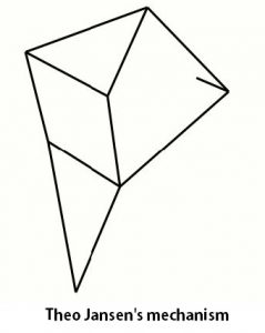 Behind that gait structure of STRANDBEEST, the mechanism involved is Theo Jansen’s mechanism. Each individual leg structure is placed side by side to form that structure. Theo Jansen’s mechanism is also sown in the previous page once again sown here.