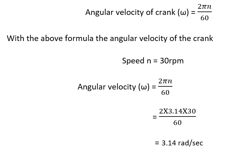 For analysis process the project considered that to fix a DC motor of 30 rpm with 5 kg torque. This is only to consider the input information for ANSYS. i.e for dynamic analysis, it should have a input information for ANSYS. By this 30 rpm speed of the motor, this will give the angular velocity of the crank by the formula for angular velocity. Here the motor power is directly transferred to the crank.