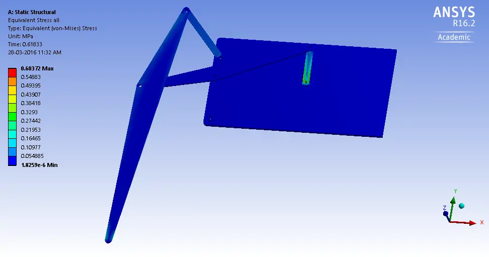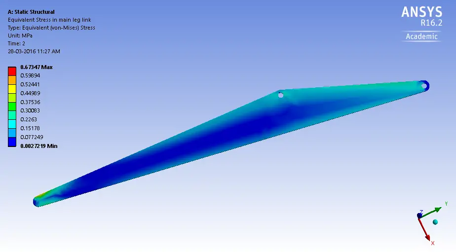 The results of structural analysis of the mechanism are shown in the following figures. Results can be understood by the colour coding in Ansys. The following figure 4.6 shows the equivalent stresses in main leg link. Here the blue colour represents the minimum value and red colour represents the maximum value as the colour bar shows the respected value according to the colour. In the main leg, the maximum stress is obtained at the point where the link contacts with the ground so here there may be more deformation so to avoid this deformation we need to make it stronger by adding material there. This will helps to avoid stress there but the stress will be transferred to another point. So the material to be added thereto transfer some amount of stress not to avoid stress.