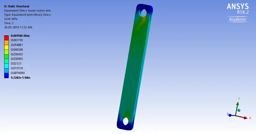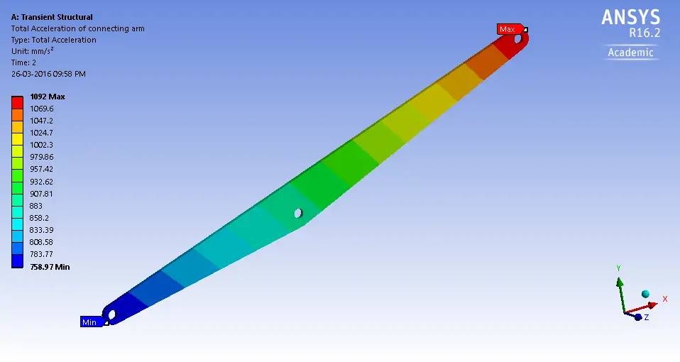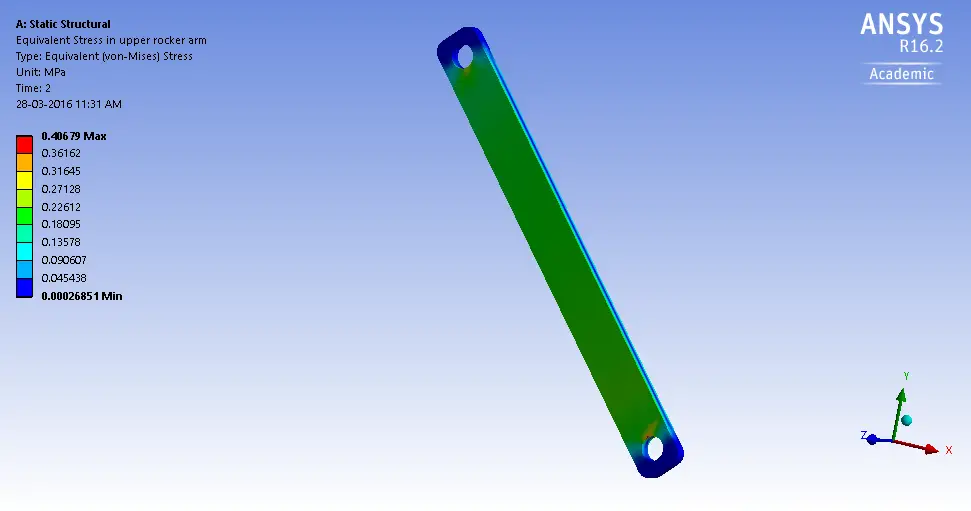The stress distribution in the connecting arm shown in the following figure 4.7. It will show the equivalent stress in connecting arm here the colour bar shows the respected stress values for the connecting arm. Here the stresses are the compressive stresses. Because the stresses are more at the points where the pivots connected to the main leg link and crank.