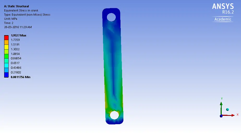 The stresses in the crank are more compared to the other components because this the link mounted on the shaft of the motor. So this link is responsible for the entire motion in the leg mechanism. So the stresses are observed more compared to the other components this stress are shown in fig 5.10