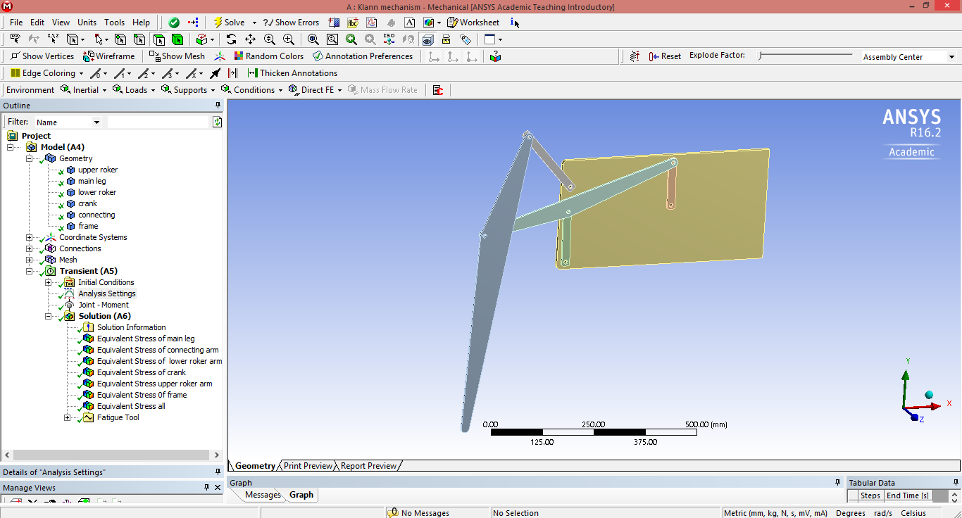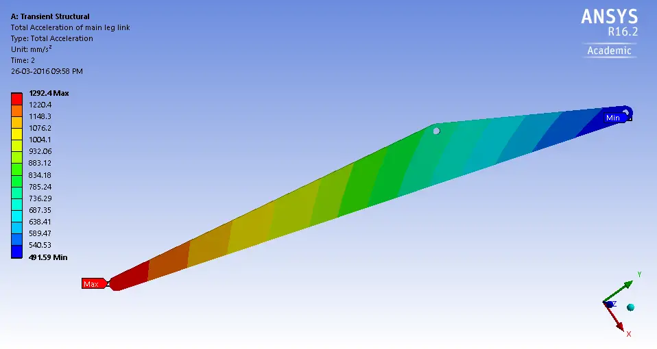 And there the project can also be going to finding out the stress in links of the leg mechanism and deformations and fatigue analysis. In fatigue analysis, the project can find out the life, damage and the safety factor.