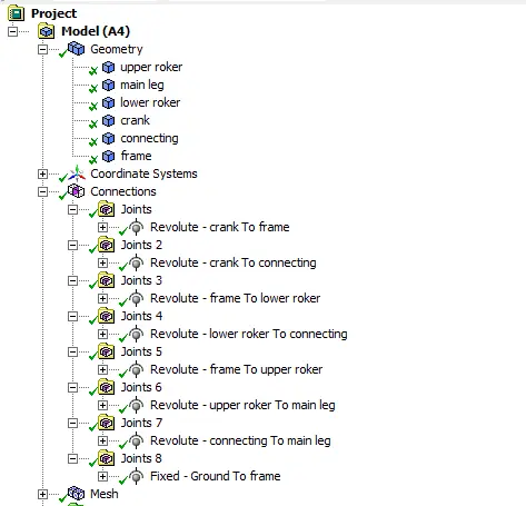 Before going to the analysis we are considering only one leg fixed to the frame. i.e half the frame length will be considered in the analysis of Klann mechanism. This will reduce the complexity of the analysis and reduce the number of the elements. This results in analysis time.