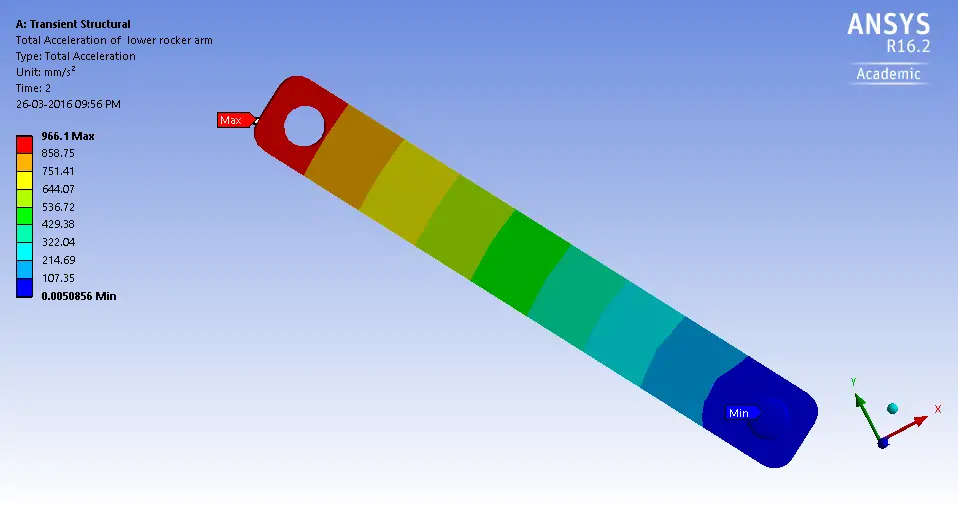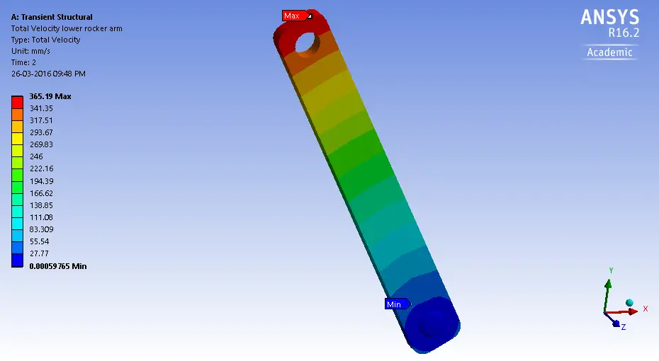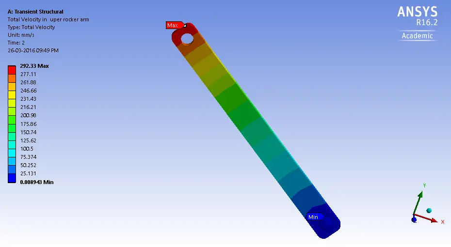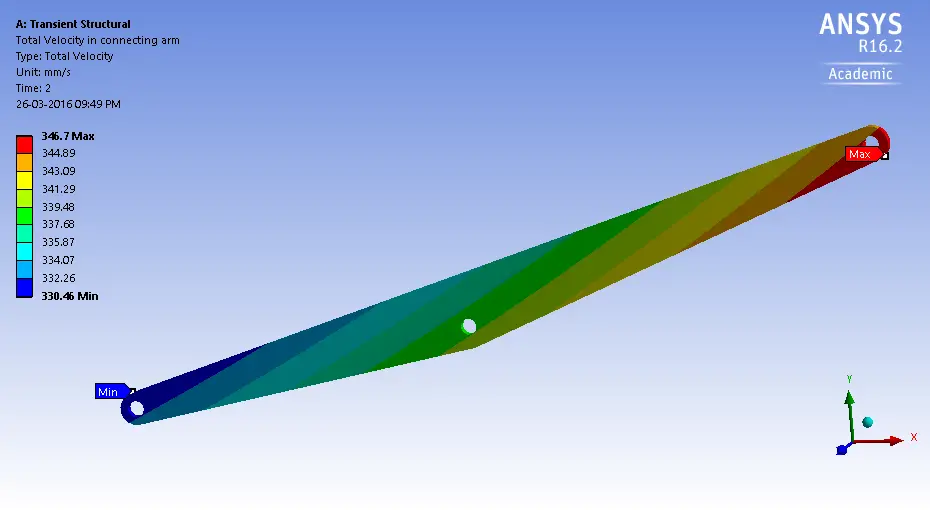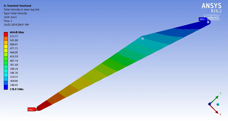 The above theoretical values are a bit less than the Ansys results because of the dimensions considering the design in cad model. But in theoretical calculations, the lengths are taken up to the centres of the joints. But in the designing of cad model, we are considering the diameter of the hole for the joints and this results in the extra velocities in Ansys results.